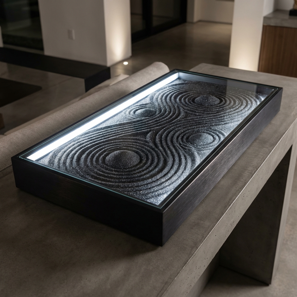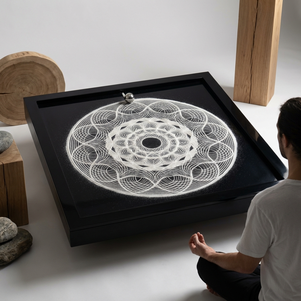 Explore the intricate patterns and measured calm of our kinetic art boards. Each image captures a unique moment in a continuous dance of sand and steel.